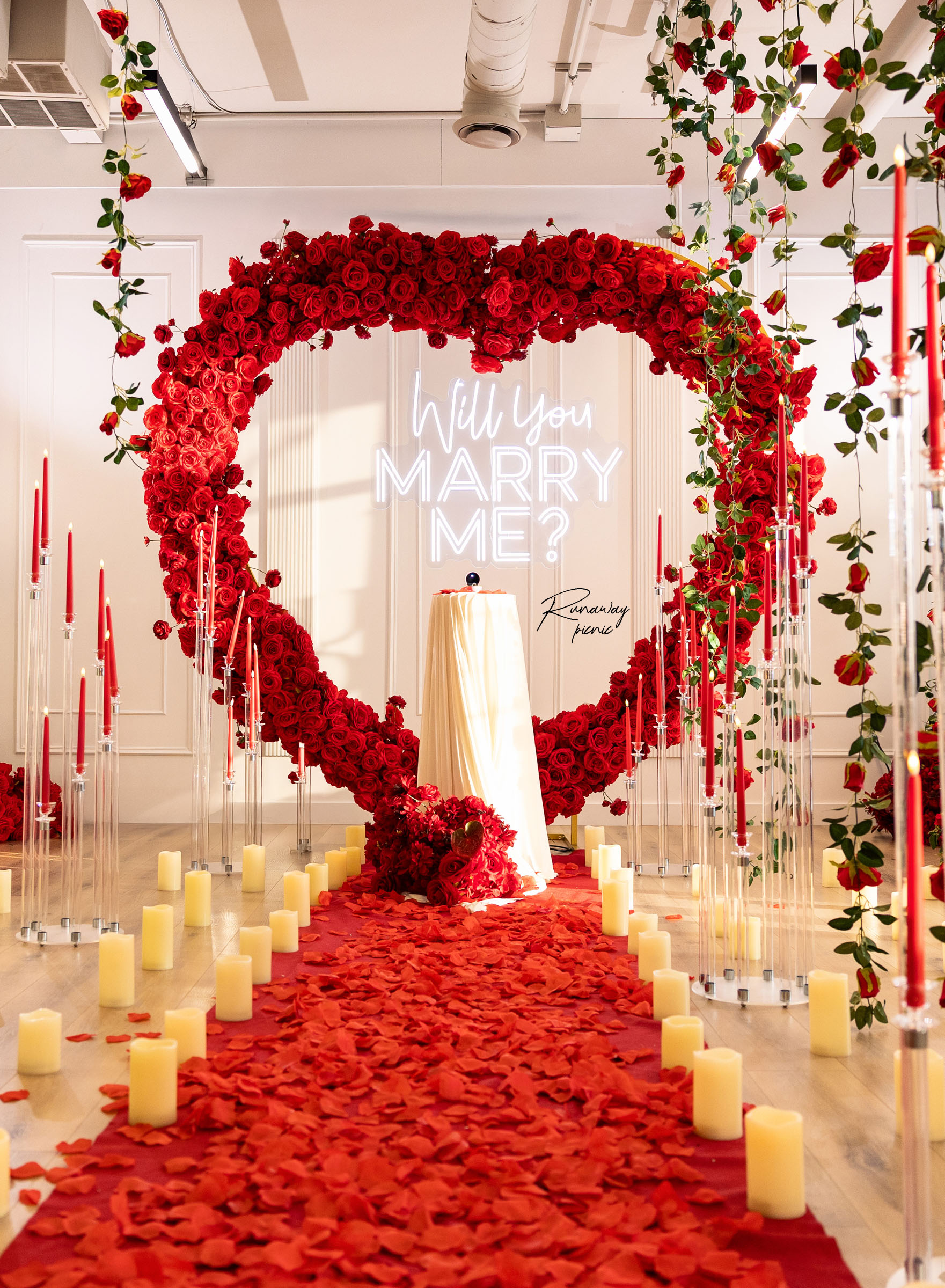 Our most requested Runaway proposal luxury setup with our tall heart arch fully decorated with beautiful red roses.